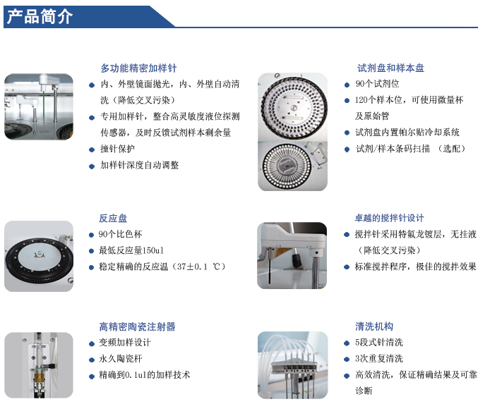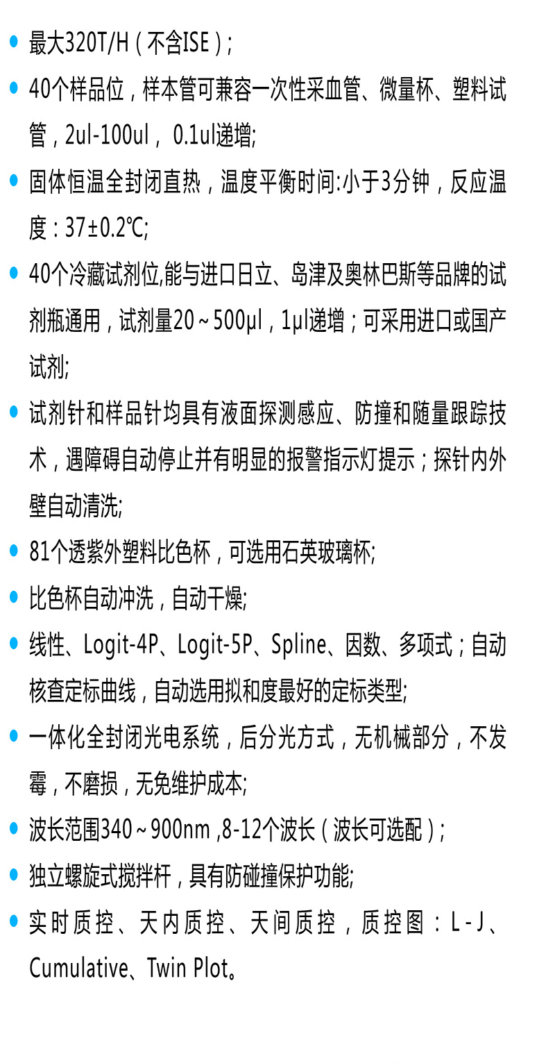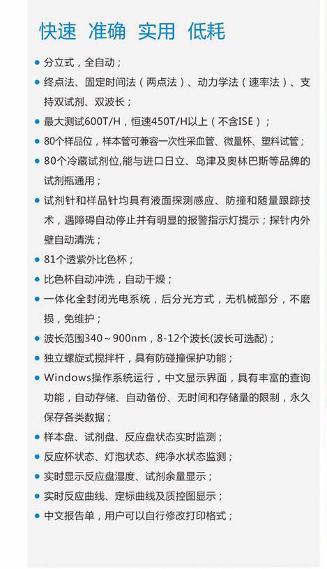 供醫(yī)療機(jī)構(gòu)對(duì)人體體液樣本成分的的定量檢測(cè),一機(jī)多用:常規(guī)生化、特定蛋白、藥物監(jiān)測(cè)、免疫比濁、離子、毒品濫用。開(kāi)機(jī)自檢故障報(bào)警,智能探針、液面定位探測(cè)功能、去離子水、清洗液液位檢測(cè)報(bào)警,防氣泡功能、防碰撞功能。