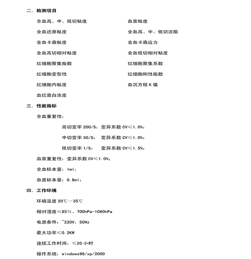 檢測19個參數:全血高、中、低切粘度、血漿粘度、全血還原粘度、全血高、中、低切流阻、全血卡森粘度、全血 卡森應力、全血高切相對粘度、全血低切相對粘度、紅細胞聚集指數、紅細胞聚集系數、紅細胞變型性、紅細胞剛性指數、紅細胞內粘度、血沉方程K值、血紅蛋白濃度。