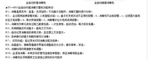首先是衛(wèi)生部于2004年4月公布的最新內(nèi)窺鏡消毒規(guī)范中注明內(nèi)窺鏡必須使用消毒槽消毒,其次:從科學(xué)的角度,內(nèi)窺鏡內(nèi)徑太細,根本不可能用儀器伸進內(nèi)窺鏡內(nèi)部進行消毒,浸泡是唯一的消毒方法。