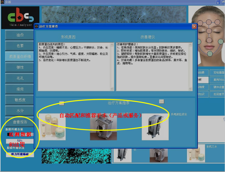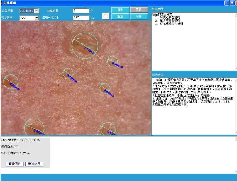4、所有項(xiàng)目分析完之后,會(huì)生成皮膚分析報(bào)告,報(bào)告里面有所有檢測(cè)項(xiàng)目的檢測(cè)數(shù)據(jù)和結(jié)果,以及自動(dòng)推薦出來(lái)的手術(shù)或藥品,并可保存或打印報(bào)告。