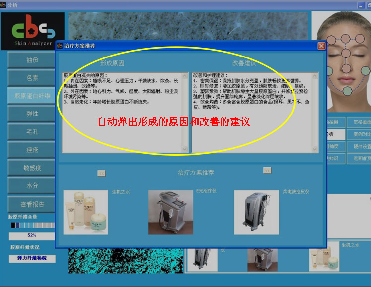2、分析出數(shù)據(jù)和結(jié)果后,瞬間彈出“形成原因”和“改善建議”對(duì)話框,同時(shí)自動(dòng)匹配和推薦出相關(guān)的改善彈性的手術(shù)或藥品。
