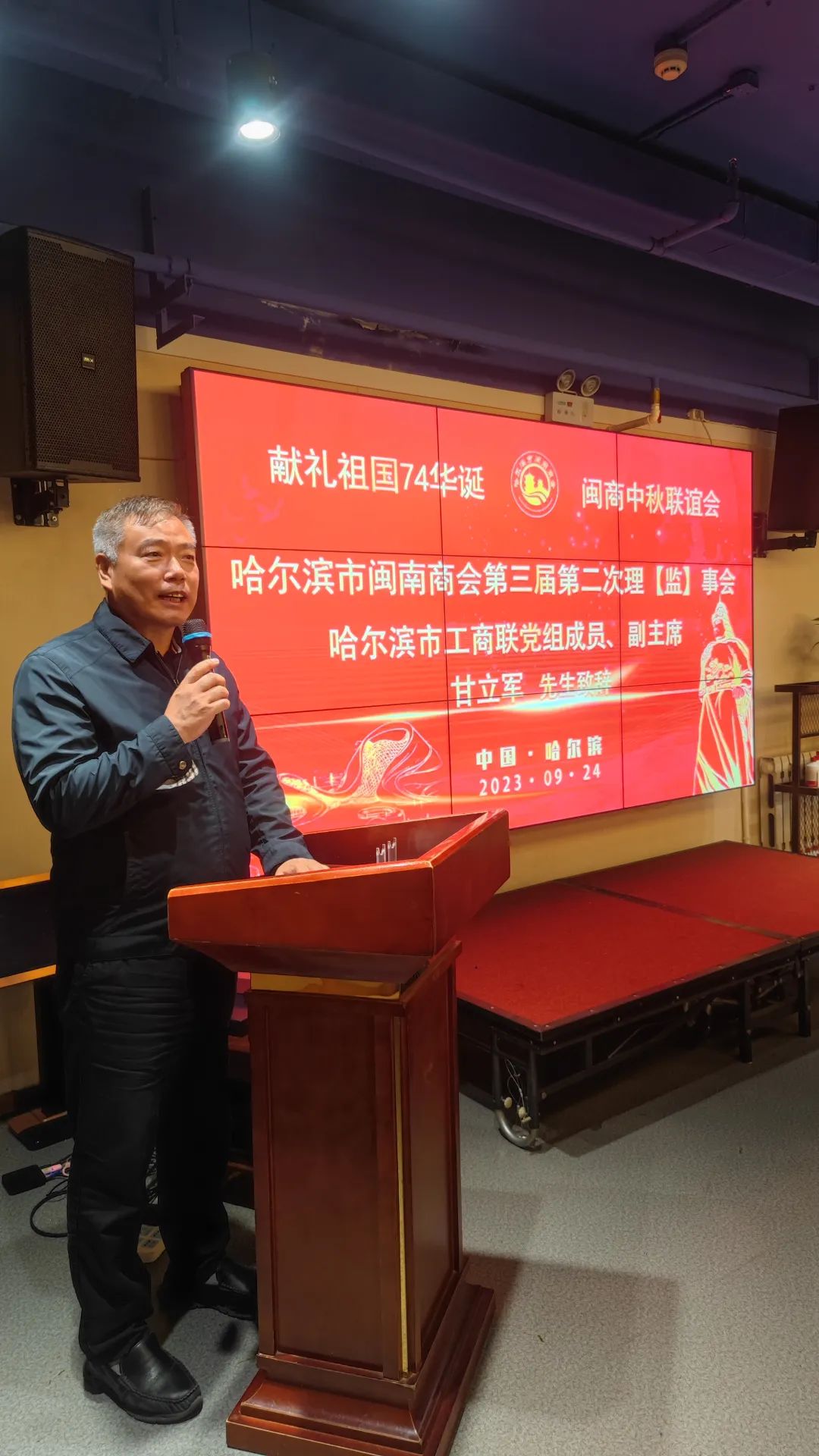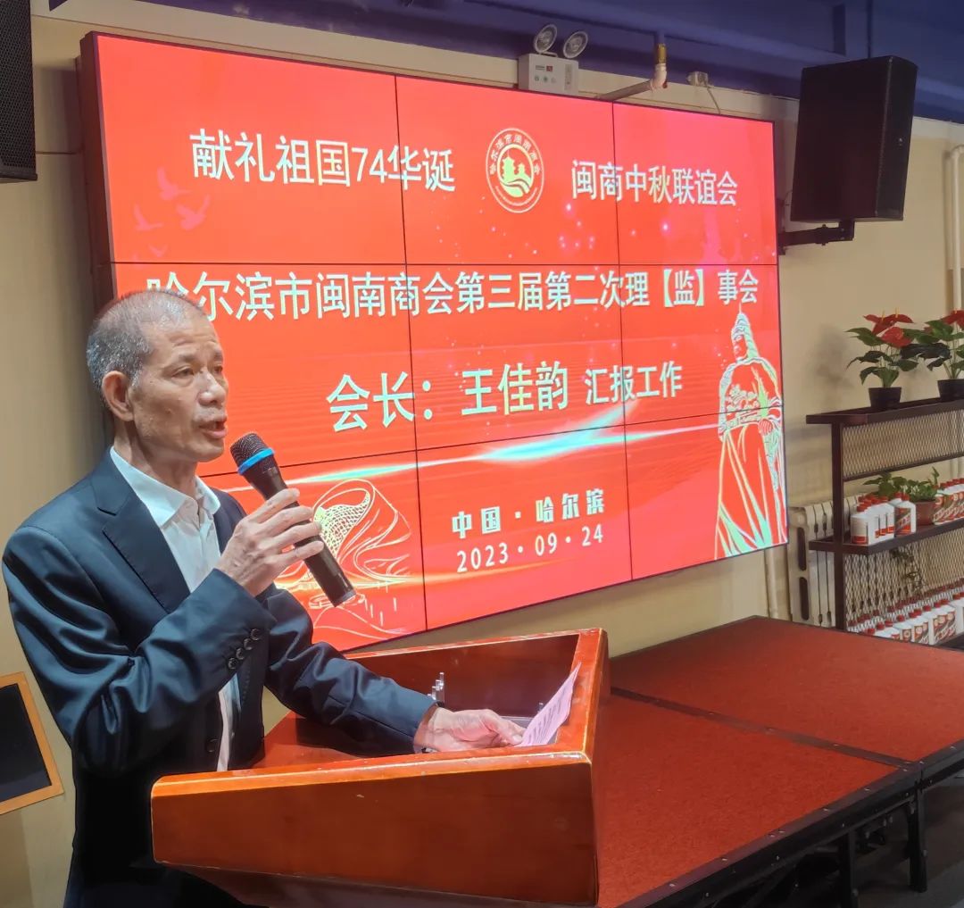 金風(fēng)迎盛世,麗日展新天。9月24日下午,在中華民族傳統(tǒng)佳節(jié)“中秋節(jié)”和偉大的祖國(guó)即將迎來(lái)74周年華誕之際,為了抒發(fā)熱愛(ài)黨,熱愛(ài)祖國(guó)情懷,踐行愛(ài)國(guó)主義精神,唱響時(shí)代主旋律,哈爾濱市閩南商會(huì)在會(huì)員單位——鷺發(fā)海鮮酒店,舉辦第三屆第二次理(監(jiān))事會(huì)暨獻(xiàn)禮祖國(guó)74華誕·閩商中秋聯(lián)誼會(huì)。哈爾濱市工商聯(lián)黨組成員、副主席甘立軍,泉州市工商聯(lián)副主席杜韶山,及哈爾濱市閩南商會(huì)理(監(jiān))事會(huì)成員參加了聯(lián)誼會(huì)。聯(lián)誼會(huì)由商會(huì)黨支部書(shū)記阮啟謙同志主持。