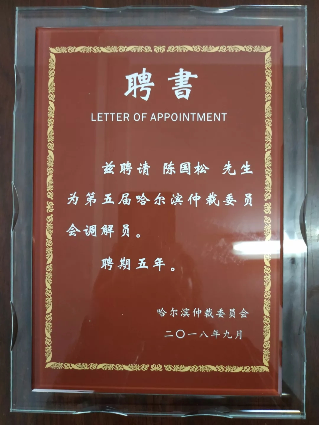 經(jīng)哈爾濱仲裁委員會研究決定,聘請我董事長陳國松先生獲聘擔(dān)任調(diào)解員一職。